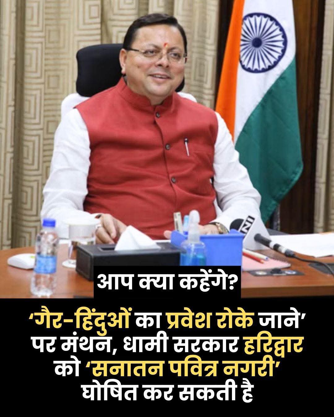 हरिद्वार को ‘सनातन पवित्र नगरी’ घोषित करने पर धामी सरकार में मंथन तेज है। गैर-हिंदुओं के प्रवेश को लेकर संभावित प्रतिबंध पर भी विचार किया जा रहा है, क्योंकि हिन्दू विरोधियों द्वारा सनानार्थियों की वीडियो क्लिप भी बना रहे हैं और चोरी की घटनायें भी बढ रही है। यद्यपि सरकार का कहना है कि सभी कानूनी और संवैधानिक पहलुओं पर विचार के बाद ही कोई निर्णय लिया जाएगा। अरे सरकार हमारा कहना है समूचे उत्तराखंड को एक देवभूमि अधिसूचित किया जाय। सभी पुराणों में देवभूमि की महिमा लिखी है, सरकारी कागजों में उत्तराखंड को देवभूमि कब अधिसूचित करोगे?
