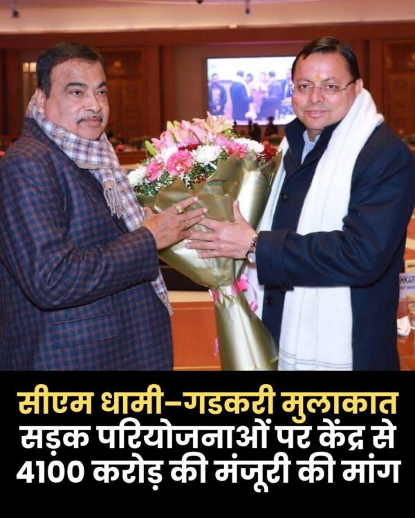 मुख्यमंत्री पुष्कर सिंह धामी ने नई दिल्ली में केंद्रीय सड़क परिवहन एवं राजमार्ग मंत्री नितिन गडकरी से मुलाकात कर उत्तराखंड की चार अहम सड़क परियोजनाओं को मंजूरी देने का अनुरोध किया। करीब 4100 करोड़ रुपये की इन परियोजनाओं का उद्देश्य राज्य में कनेक्टिविटी मजबूत करना, पहाड़ी क्षेत्रों में सुरक्षित आवागमन सुनिश्चित करना और पर्यटन व आर्थिक गतिविधियों को बढ़ावा देना है। धामी ने कहा कि इन सड़कों से सीमांत और दूरस्थ इलाकों को भी बेहतर सुविधा मिलेगी।