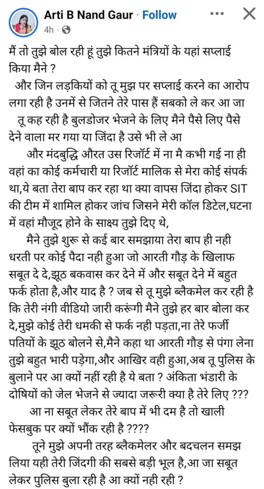 उन्होंने कहा कि #अंकिता_भंडारी केस में हाईकोर्ट से निर्णय आ चुका है दोषियों को सजा हो चुकी है इसके बाद ऐसा अनर्गल प्रलाप एक राजनीतिक षड्यंत्र है, कोई दल उर्मिला को मोहरा बना रहा है, राजनीतिक लाभ के लिए ऐसा #षड्यंत्र नहीं करना चाहिए।