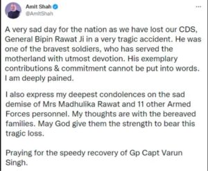 रक्षामंत्री राजनाथ सिंह ने उनकी मृत्यु पर शोक व्यक्त किया और देश के लिए इसे अपूरणीय क्षति बताया। देश के गृहमंत्री अमित शाह ने भी घटना पर गहन शोक जताया और इस पर चिंता जताते हुए कहा कि इस घटना से देश स्तब्ध है। सुरक्षा एजेंसियों द्वारा गहन और सभी दृष्टिकोण से जांच शुरू कर दी गयी है।
