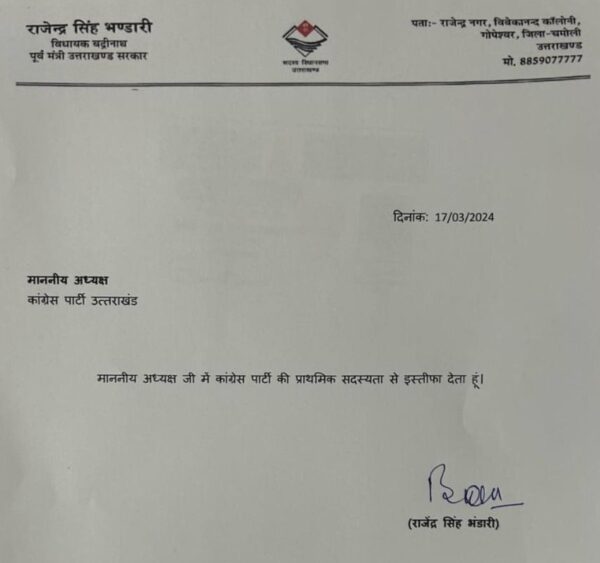 उत्तराखंड में कांग्रेस लड़खड़ा गयी है उसके एक एक पाये टूट रहे हैं। विशेष रूप से राजेंद्र सिंह भंडारी और विजपाल सजवाण जैसे भारी जनाधार वाले नेताओं के त्यागपत्र से कांग्रेस में खलबली मच गयी है। लोकसभा चुनाव की तिथियों की घोषणा होते ही कांग्रेस विधायक राजेंद्र सिंह भंडारी ने पार्टी से इस्तीफा दे दिया है। बदरीनाथ विधायक राजेंद्र भंडारी ने प्रदेश अध्यक्ष करन महारा को एक लाइन में त्याग पत्र सौंपा है। राजेंद्र भंडारी ने दिल्ली में भाजपा की सदस्यता ग्रहण की है, इसका अर्थ हुआ यह सैटिंग उपर लेबल की है। ये माना जा रहा है कि राजेंद्र भंडारी बदरीनाथ सीट पर दोबारा चुनाव लड़ सकते हैं।
