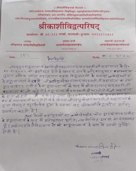काशीविद्वतपरिषद ने दिनांक 11 नवम्बर 2022 को जारी आधिकारिक पत्र के माध्यम से ज्योतिष्पीठ पर अन्नंत विभूषित स्वामी अविमुक्तेस्वरानन्द जी की पद-प्रतिष्ठा को न्यायोचित एवं शास्त्र सम्मत बताते हुए उनकी पुष्टि की है। इसके बाद ज्योतिष्पीठ पर स्वामी अविमुक्तेस्वरानन्द की प्रतिष्ठा पर चंद लोगों द्वारा उठाए जा रहे प्रश्नों का भी पटाक्षेप हो गया है।