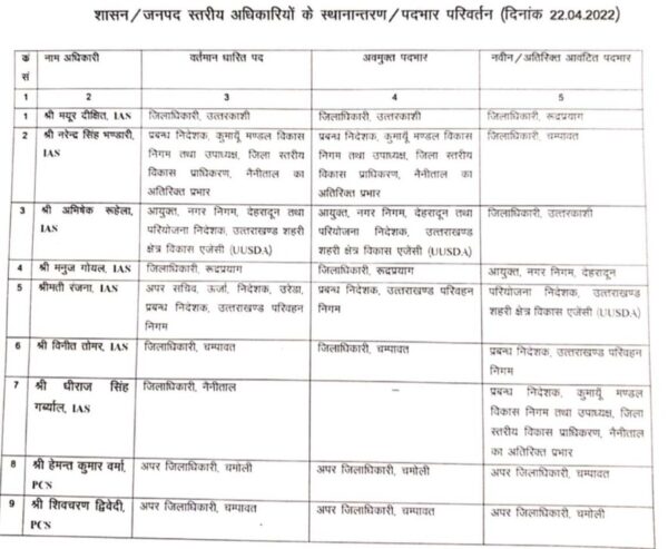 मुख्यमंत्री पुष्कर सिंह धामी ने 7 IAS और 2 PCS अधिकारीयों के साथ ही 3 जिलों के DM   स्थानांतरित कर दिए।