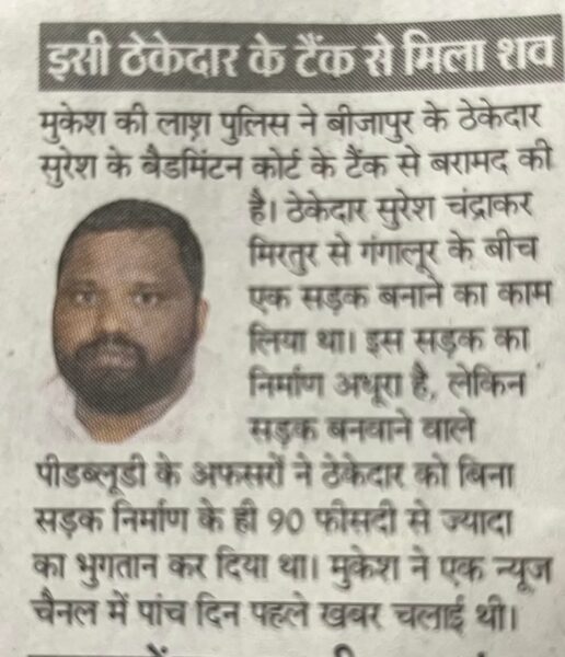अंग्रेजी वर्ष के पहले दिन 1 जनवरी की शाम को अचानक लापता हो गए बीजापुर (छत्तीसगढ़) में एक युवा पत्रकार मुकेश चंद्राकर की निर्मम हत्या कर दी गई। ठेकेदार के सेप्टिक टैंक में मिले उनके शव पर धारदार हथियार के निशान पाए गए हैं।