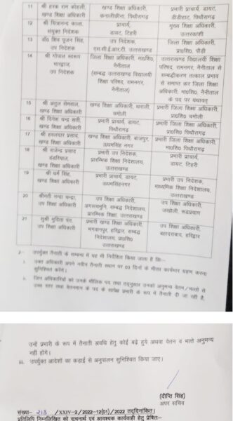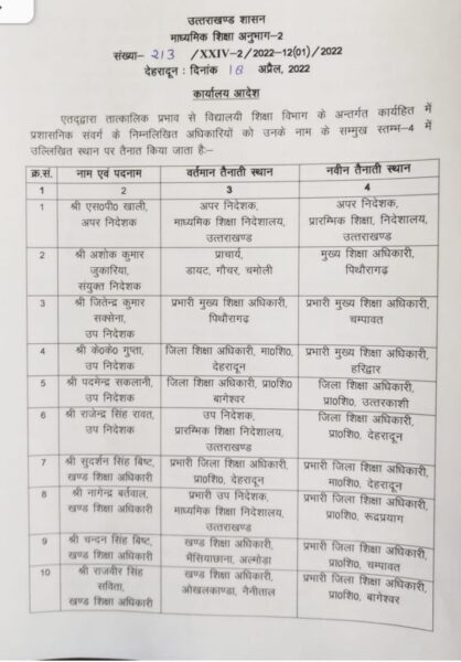 देहरादून : १९-४-२०२२ विद्यालय शिक्षा के अंतर्गत शिक्षा विभाग ने भारी संख्या में अधिकारियों में के दायित्वों में फेरबदल किया है अनेक अधिकारियों का अंतर्जनपदीय स्थानांतरण भी किया है। शिवप्रसाद खाली को अपर निदेशक माध्यमिक शिक्षा के स्थान पर अपर निदेशक प्राथमिक शिक्षा बनाया गया है।पूरी उक्तवत सूचि संलग्न है।