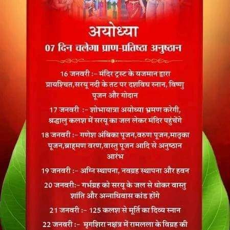 Read more*अयोध्या जी धाम* *07 दिन चलेगा प्राण प्रतिष्ठा अनुष्ठान* *16 जनवरी -:* मंदिर ट्रस्ट के यजमान द्वारा प्रायश्चित , सरयू नदी तट पर दशविध स्नान