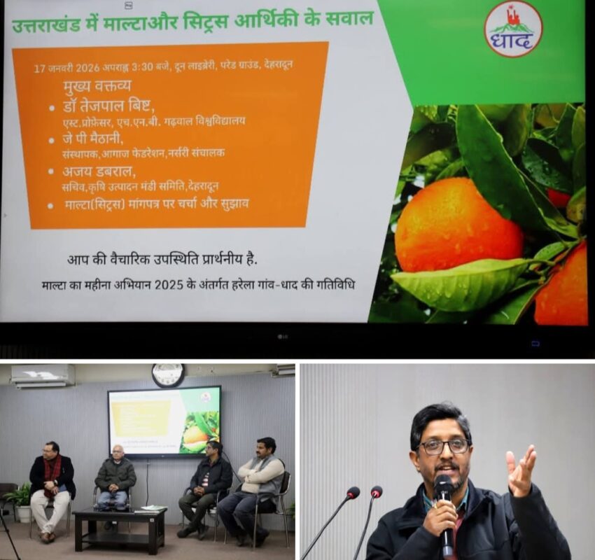 माल्टा का महीना अभियान मे सिट्रस आर्थिकी पर दून लाइब्रेरी मे चर्चा आयोजित हुयी. हरेला गाँव धाद की पहल पर आयोजित विमर्श मे आगाज फेडरेशन के जगदम्बा मैठानी,क़ृषि उत्पादन मंडी समिति के सचिव अजय डबराल, गढ़वाल विश्वविद्यालय के प्रोफ़ेसर डॉ तेजपाल बिष्ट ने अपना पक्ष रखा.