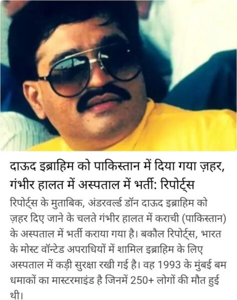पाकिस्तानी मीडिया में भारत के मोस्ट वॉन्टेड और भगौड़ा घोषित दाऊद इब्राहिम की जहर देकर हत्या की खबर सुर्खियों में है। बताया जा रहा है कि दाऊद इब्राहिम किडनी की गंभीर बीमारी से पीडि़त था और कराची के मुमताज नामक चिकित्सालय में कुछ समय से उपचार कर रहा था। इसी बीच शुक्रवार की शाम में भर्ती दाऊद को जहर देकर मार दिया गया।