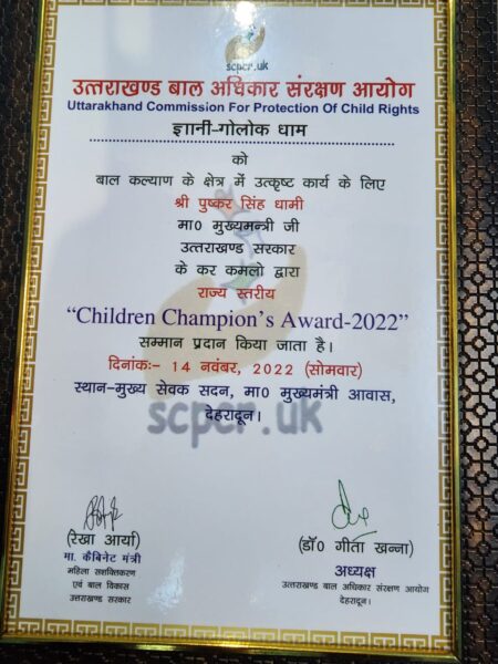 उत्तराखंड बाल संरक्षण आयोग द्वारा निराश्रित एवं असहाय बच्चों की सहायता व सहयोग के लिए वर्ष 2021 – 22 के लिए अनेक व्यक्तियों को सम्मानित किया गया। यह कार्यक्रम बाल दिवस के अवसर पर देहरादून में आयोजित हुआ इस कार्यक्रम में राज्य बाल संरक्षण आयोग द्वारा निराश्रित एवं असहाय बच्चों के लिए इस क्षेत्र में कार्य व सहयोग करने हेतु अनेक विभूतियों को सम्मानित किया गया।