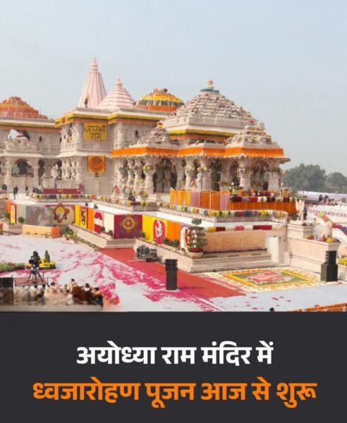 क्या आप इस ऐतिहासिक क्षण के लिए उत्साहित हैं? अपनी भावनाओं को कमेंट में व्यक्त करें और इस पोस्ट को हर राम भक्त तक पहुंचाएं!राम मंदिर परिसर में धार्मिक अनुष्ठान शुरू हो गया है। अयोध्या और काशी के प्रकांड विद्वान धार्मिक अनुष्ठान संपन्न करा रहे हैं। जान लें कि राम मंदिर में ये पूजा-पाठ, ध्वजारोहण समारोह के निमित्त चल रहा है। राम मंदिर की यज्ञशाला में यज्ञ की आहुतियां डाली जा रही हैं। वेद की ऋचाओं का पारायण हो रहा है। रामार्चा और राम रक्षा स्त्रोत का पाठ किया जा रहा है। इसके अलावा, वाल्मीकि रामायण और रामचरितमानस का पाठ भी हो रहा है। बता दें कि राम मंदिर ट्रस्ट के सदस्य डॉक्टर अनिल मिश्रा सपत्नी राम मंदिर के ध्वजारोहण समारोह के मुख्य यजमान हैं। यहां नवग्रह पूजा के साथ धार्मिक अनुष्ठान शुरू हुआ है। राम मंदिर के शिखर पर जिस ध्वजा का ध्वजारोहण होगा, वह खास है. यह ध्वजा मौसम की मार से प्रभावित नहीं होगी। 191 फीट की ऊंचाई पर ध्वज लहराएगा। यह ध्वज 22 फीट लंबा और 11 फीट चौड़ा होगा। इसका वजह करीब ढाई किलो का होगा। राम मंदिर का शिखर जमीन से 161 फिट ऊंचा है।