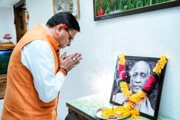 मुख्यमंत्री श्री पुष्कर सिंह धामी ने राष्ट्रीय एकता दिवस के अवसर पर मुख्यमंत्री आवास में सरदार वल्लभ भाई पटेल के चित्र पर श्रद्धा सुमन अर्पित कर श्रद्धांजलि दी।