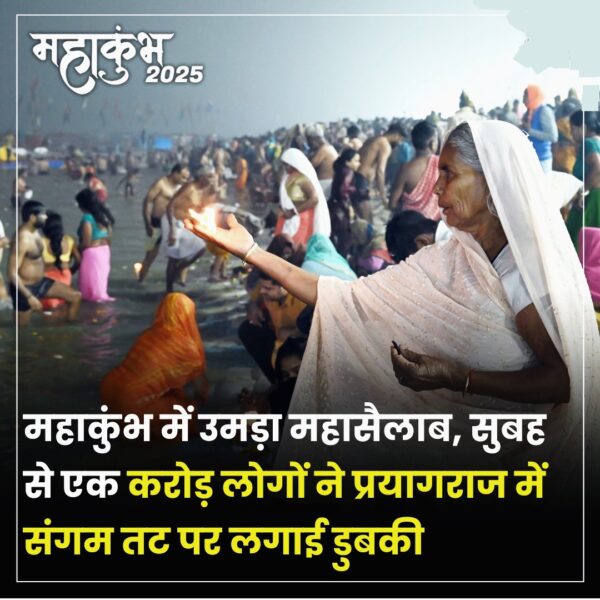 महाकुंभ स्नान के पहले ही दिन एक करोड़ से अधिक लोगों ने प्रयागराज महाकुंभ में किया गंगा स्नान। प्रयागराज के एडीजी प्रयागराज जोन भानु भास्कर ने बताया कि अब तक एक करोड़ लोग प्रयागराज में आस्था की डुबकी लगा चुके हैं। बता दें कि संगम तट पर पवित्र स्नान करने के लिए सुबह से ही भक्तों की भारी भीड़ लग रही। इस महाकुंभ में अनेक देशों के विभिन्न मतों के लोगों सहित एप्पल की मालकिन ने किया सन्यास ग्रहण।गंगा में डुबकी भी लगाई।