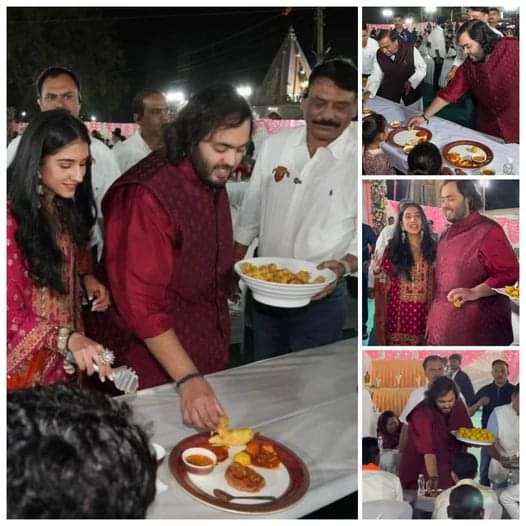 भारत के सबसे बड़े बिजनेसमैन मुकेश अंबानी के बेटे और बहू दोनों ही अपनी शादी में आए मेहमानों को भोजन परोसते हुए देखे जा सकते हैं। मुकेश अंबानी ने अपने बेटे को सनातन धर्म संस्कृति के उत्तम संस्कार दिए हैं, इसके साथ ही राधिका मरचेंट भी अनंत अंबानी के साथ भोजन परोसते हुए देखी जा सकती है। इस से ही दोनों के बीच कमाल की बॉन्डिंग (स्नेह) का अनुमान लगाया जा सकता है। अनंत अंबानी और राधिका मरचेंट का विवाह संस्कार शीघ्र ही जामनगर गुजरात में होने वाला है दोनों के विवाह का शगुन आरंभ शुरू हो चुका है। विवाह समारोह के मीनू में सभी व्यंजन शाकाहारी रहेंगे अन्नंत अंबानी विवाह संस्कार के शुभारम्भ पर मुकेश अंबानी और नीता अंबानी अतिथियों को भोजन परोसते दिखे। वैसे तो विवाह जामनगर गुजरात में होना सुनिश्चित है लेकिन समझा जाता है कि अनेक जगह पर विभिन्न आयोजन रखे जाने हैं अपुष्ट सूत्रों के अनुसार त्रियुगी नारायण में भी हो सकता है वैवाहिक संस्कार हेतु एक डेस्टिनेशन।