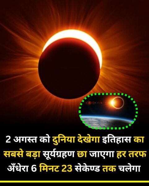 2 अगस्त को दुनिया देखेगी 100 साल का सबसे बाद सूर्यग्रहण और पहली बार ऐसा सूर्यग्रहण होने जा रहा है जिसके होने के बाद पूरा अँधेरा छा जाएगा वो भी लगभग 6 मिनट 23 सेकेण्ड तक चलेगा हर तरफ अँधेरा रहेगा पूरी तिथि की बात करें तो 2 अगस्त 2027 सोमवार के दिन यह पूर्ण सूर्यग्रहण होने वाली है इस दिन सूर्य को पूरी तरह से चन्द्रमा घेर लेगी और धरती पर एक अलग नजारा दिखेगा।