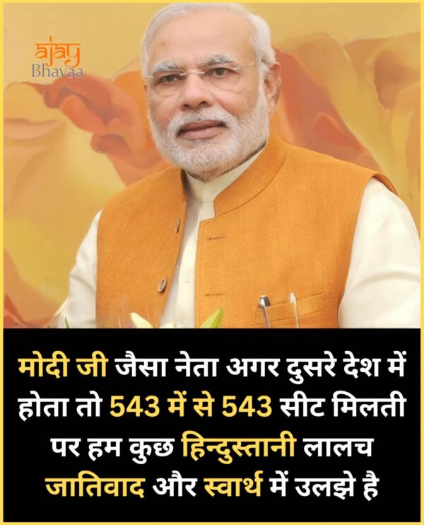 सोचिए, यदि मोदी जी किसी और विकसित देश में होते, जहाँ की जनता राष्ट्रहित को सबसे ऊपर रखती है, तो उन्हें 543 में से 543 सीटें मिलतीं! वहाँ विकास और राष्ट्र गौरव के नाम पर शत-प्रतिशत समर्थन मिलता है, क्योंकि जनता देश के विजन को पहचानती है।