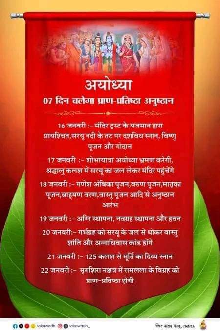 *16 जनवरी -:* मंदिर ट्रस्ट के यजमान द्वारा प्रायश्चित , सरयू नदी तट पर दशविध स्नान , विष्णु पूजन और गो दान