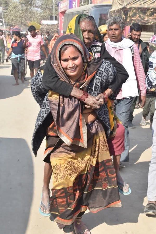 फिरोजाबाद की ८५ वर्षीय सास #फूलकली की इच्छा महाकुम्भ में स्नान की थी, चलने में असमर्थ थीं, तो उनकी गुणवान बहू #रामवती उन्हें स्नान के लिए घुघुती (पीठ?) पर ले कुंभ स्नान हेतु ले आई।