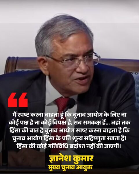 भारत के मुख्य चुनाव आयुक्त ज्ञानेश कुमार ने #BiharElection2025 पर कहा, “… मैं स्पष्ट करना चाहता हूं कि चुनाव आयोग के लिए ना कोई पक्ष है ना कोई विपक्ष है, सब समकक्ष हैं… जहां तक हिंसा की बात है चुनाव आयोग स्पष्ट करना चाहता है कि चुनाव आयोग हिंसा के प्रति शून्य सहिष्णुता रखता है। हिंसा की कोई गतिविधि बर्दाश्त नहीं की जाएगी। सामान्य मतदाता शांतिपूर्वक अपनी स्वेच्छा के अनुसार पारदर्शी तरीके से मतदान कर पाए उसके लिए चुनाव आयोग तैयार है।”