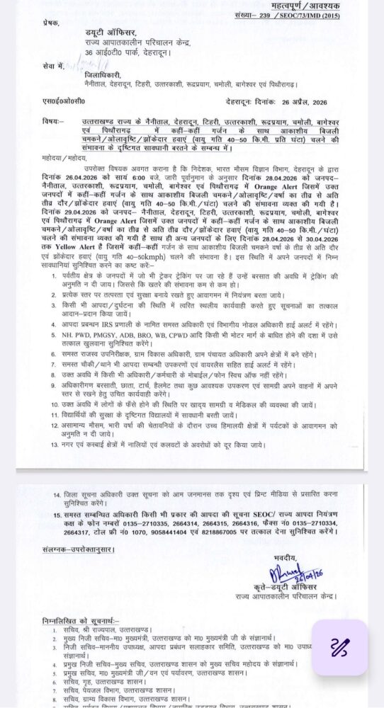 उत्तराखंड मौसम की राज्य आपातकालीन परिचालन केन्द्र की सूचना में भी कुछ जनपदों के लिए आधी तुफान से सुरक्षित रहने की चेतावनी दी गयी है।