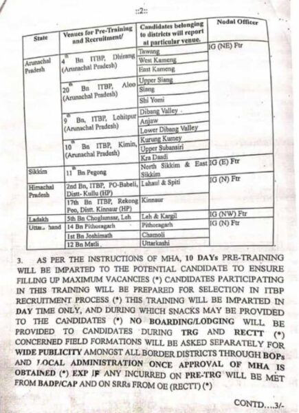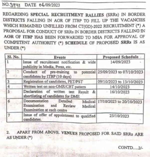 वर्ष २०२२ में एस० एस० सी० द्वारा भारत तिब्बत सीमा पुलिस बल में सिपाही जनरल ड्यूटी के पद पर नियुक्ति हेतु आयोजित की गई भर्ती परीक्षा में जो पद रिक्त रह गए थे उन्हें विशेष भर्ती रैली के माध्यम से भरने के लिए भारत तिब्बत सीमा पुलिस द्वारा प्रपोजल गृह मंत्रालय को प्रेषित किया गया है।। उत्तराखंड राज्य के तीन सीमांत जिलों पिथौरागढ़, चमोली एवं उत्तरकाशी के अभियार्थियों के लिए विशेष भर्ती रैली आयोजित किए जाने से संबंधित नोटिफिकेशन दिनांक 14 सितंबर 2023 को जारी किया जाएगा तथा संपूर्ण भर्ती प्रक्रिया पूर्ण होने के उपरांत दिनांक 25 अक्टूबर 2023 तक भारत तिब्बत सीमा पुलिस बल में में सिपाही सामान्य ड्यूटी के पद पर चयन हेतु योग्य पाए गए अभ्यर्थियों को नियुक्ति प्रस्ताव जारी करने की कार्यवाही पूर्ण की जाएगी।।।। इस भर्ती रैली हेतु उत्तरकाशी जिले के अभियार्थिओं के लिए भर्ती के आयोजन के साथ साथ दिनांक 25 सितंबर से 7 अक्टूबर तक प्री ट्रेनिंग का भी आयोजन 12वीं वाहिनी मातली में किया जाना प्रस्तावित है।। जो भी अभियार्थी भारत तिब्बत सीमा पुलिस बल में सिपाही सामान्य ड्यूटी के पद पर नियुक्ति पने के इच्छुक हैं वह समय से प्री ट्रेनिंग के साथ साथ दिनांक 14 सितंबर 2023 को जारी होने वाले नोटिफिकेशन के सापेक्ष अपना पंजीकरण करवाना सुनिश्चित करें।