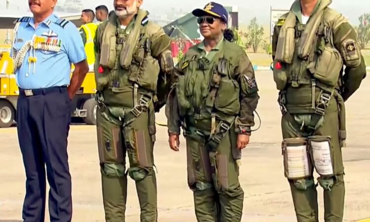 राष्ट्रपति द्रौपदी मुर्मू अंबाला एयरफोर्स स्टेशन से राफेल विमान में उड़ान भर रही हैं। वायुसेना की वर्दी पहने राष्ट्रपति की का चित्र सम्मुख आया है।