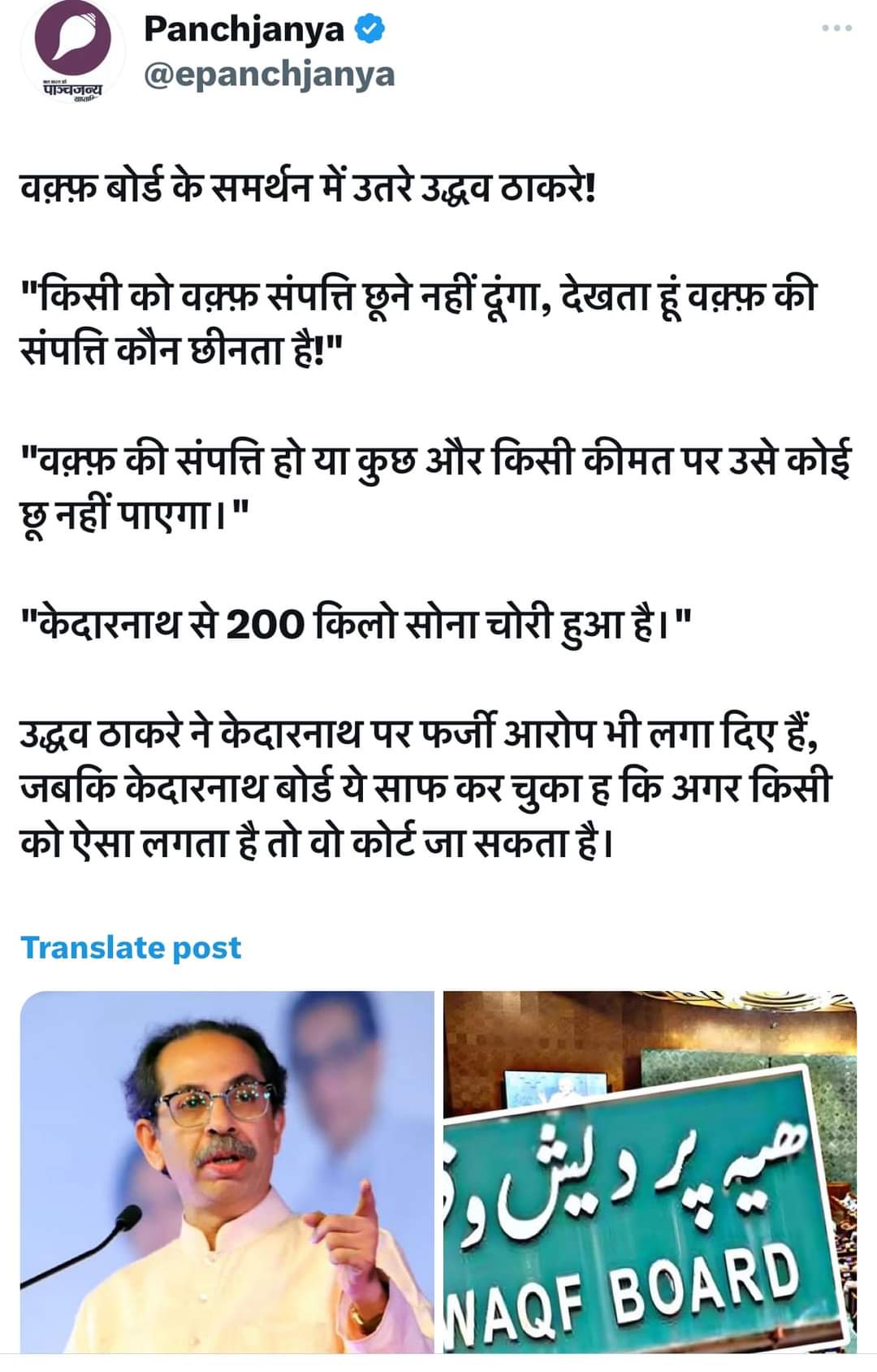कांग्रेस और उनके समर्थक एक सुनियोजित षड्यंत्र के अन्तर्गत लगातार श्री केदारनाथ धाम के गर्भगृह में स्वर्ण परत चढ़ाये जाने के प्रकरण पर दुष्प्रचार अभियान चलाए हुए हैं। जबकि देश-दुनिया से श्री केदारनाथ धाम के दर्शन करने वाले श्रद्धालुओं के लिए गर्भ गृह की स्वर्णिम आभा एक आकर्षण का केंद्र बनी हुई है। श्री केदारनाथ धाम के गर्भगृह में स्वर्ण परत चढ़ाने का कार्य एक निर्धारित प्रक्रिया के तहत हुआ है। मगर कुछ लोग राजनीतिक स्वार्थों के चलते श्री केदारनाथ धाम को विवाद का केंद्र बना रहे हैं। कुछ समय पूर्व एक स्वामी अविमुक्तेश्वरा नंद ने श्री उद्धव ठाकरे से भेंट कर गर्भ गृह को स्वर्ण मंडित किए जाने के मामले पर सवाल उठाए थे। उसके पश्चात आज श्री ठाकरे ने महाराष्ट्र विधान सभा चुनावों की दृष्टिगत हिंदुओं के विश्व प्रसिद्ध धाम में स्वर्ण परत चढ़ाये जाने के कार्य को संदेहास्पद बताया है।