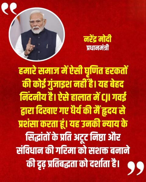 प्रधानमंत्री नरेंद्र मोदी ने CJI डी.वाई. चंद्रचूड़ गवई पर वस्तु उछालने कोशिश की घटना पर तीखी प्रतिक्रिया दी। उन्होंने कहा, “हमारे समाज में ऐसी घृणित हरकतों की कोई गुंजाइश नहीं है। यह बेहद निंदनीय है।”