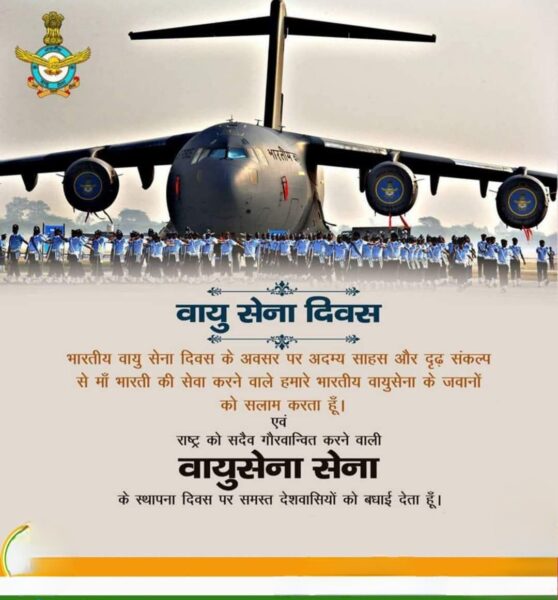भारतीय वायु सेना दिवस रक्षामंत्री राजनाथ ने दी बधाई, उन्होंने कहा भारतीय वायु सेना दिवस के अवसर पर अदम्य साहस और दृढ़ संकल्प से मां भारती की सेवा करने वाले हमारे भारतीय वायुसेना के जवानों को सलाम करता हूं एवं राष्ट्र को सदैव गौरवान्वित करने वाली वायु सेना के स्थापना दिवस पर आप सभी को बधाई देता हूं।।