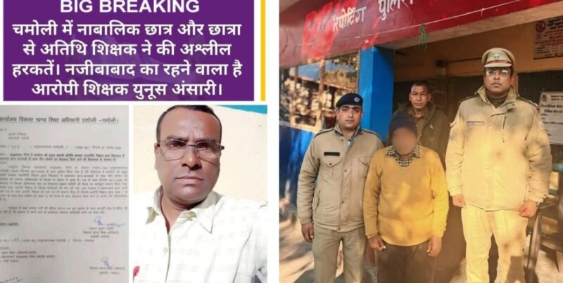चमोली पुलिस ने दो नाबालिग छात्राओं के यौन उत्पीड़न के आरोपी अतिथि प्रवक्ता यूनुस अंसारी को 12 घंटे के भीतर गिरफ्तार कर लिया है। आरोपी को उत्तर प्रदेश के बिजनौर से पकड़ा गया और न्यायिक हिरासत में जेल भेज दिया गया। चमोली जिले में नियत छेड़छाड़ व योन शोषण का आरोपी समुदाय विशेष के एक शिक्षक को गिरफ्तार किया गया है। लोगों ने मांग की है कि छात्राओं से छेड़छाड़ व योन शोषण का आरोपी शिक्षा विभाग का कलंक नजीबाबाद निवासी युनूस अंसारी के सभी पत्रजात नियुक्ति और दो दो फर्जी निवास प्रमाण पत्रों की भी जांच हो। इस पर पोक्सो एक्ट लगे और शिक्षा विभाग से तत्काल बर्खास्त हो। साथ ही जिन्होंने ने भी इसके फर्जी पत्रजात बनाने में सहयोग किया उन्हें भी दंडित करें। अभी समाचार ये आ रहा है कि चमोली में नाबालिगों का शोषण करने वाला शिक्षा मित्र यूनुस अंसारी उत्तर प्रदेश के बिजनौर से गिरफ्तार कर लिया गया है। breakinguttrakhand.com