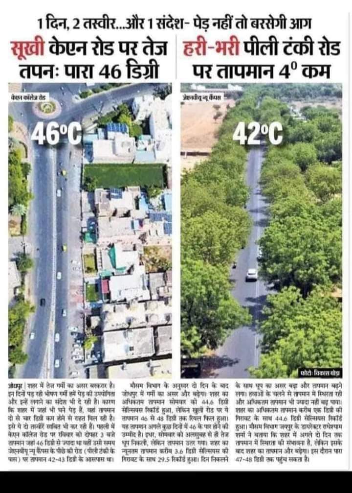 एक ही है समाधान जम कर पेड़ लगाओ सूर्य देवता की अग्नि वर्षा का संदेश स्पष्ट है हर व्यक्ति पेड़ लगाये और उसकी देखभाल भी करे नहीं तो तापमान ५२ डिग्री तक इसी वर्ष जायेगा और जिस वर्ष ६० डिग्री जायेगा तो मनुष्यों का जीवंत रहना संभव नहीं