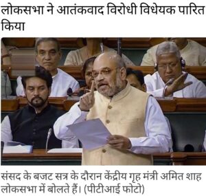 *बड़ी खबर*गैरकानूनी गतिविधियां संशोधन विधेयक लोकसभा के मानसून सत्र में पारित हो गया, जब कांग्रेस और कई विपक्षी दलों ने मंत्री के जवाब के बाद विधेयक को स्थायी समिति को भेजने की मांग करते हुए बहिर्गमन किया। गृह मंत्री अमित शाह ने आतंकवाद विरोधी कानून में संशोधन का बचाव करते हुए कहा कि भाजपा के नेतृत्व वाली सरकार कभी भी इसके प्रावधानों का दुरुपयोग नहीं करेगी। लोकसभा की शुरुआत कई कागजात मेज पर रखे जाने के साथ हुई लेकिन कश्मीर मुद्दे पर अमेरिकी राष्ट्रपति के बयान पर हंगामा जारी रहा। लोकसभा ने बुधवार को गैरकानूनी गतिविधियां (रोकथाम) संशोधन विधेयक, 2019 पारित कर दिया, जो अन्य बातों के अलावा, केंद्र को न केवल संगठनों बल्कि व्यक्तियों को भी आतंकवादी के रूप में नामित करने की शक्ति देने का प्रावधान करता है, यदि ऐसा करते हुए, तैयारी करते हुए, प्रचार करते हुए या पाए जाने पर आतंकी कृत्य में शामिल.