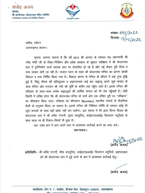 बद्रीनाथ केदारनाथ मंदिर समिति के अध्यक्ष अजेंद्र अजय ने कहा कि “श्री केदारनाथ धाम में मौसम की प्रतिकूलता और अज्ञानतावश कई लोग जूते- चप्पलों सहित मंदिर के समीप तक पहुंच जाते हैं। इससे मंदिर की पवित्रता भी भंग होती है। इस समस्या के निराकरण के लिए मेरे द्वारा प्रदेश के पर्यटन सचिव श्री दिलीप जावलकर से दूरभाष पर वार्ता की गई और उन्हें पत्र भी भेजा गया है।”