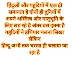 पिछले हजार सालों से हमें मिटाया गया *खदेड़ा गया* कब्जाया जाता रहा *हम मिटे नहीं* हारे नहीं और न आगे कभी हारेंगे *हम जीतेंगे* हम जीत कर रहेंगे *हम 3000 सालों से यरुशलम में ही थे* आज हम अपने पहले देश इजराइल में हैं *यह हमारा ही था* हमारा ही है *और हमारा ही रहेगा* येरूसलम हमसे है और हम येरूसलम से हैं।