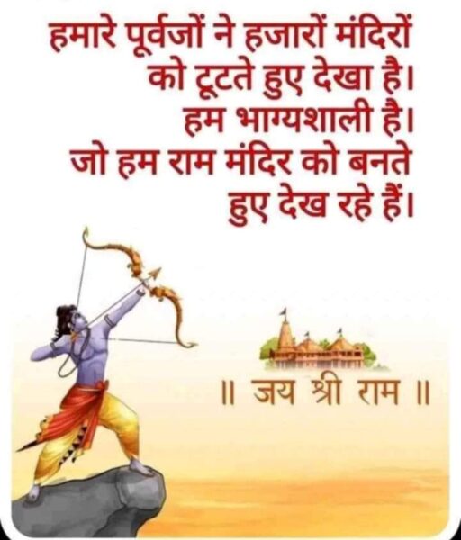 न भूतो न भविष्यति: २२ जनवरी २०२४ को शुभ लग्न अनला संवत्सर विक्रम संवत २०८०, शक संवत १९४५ (शोभकृत संवत्सर), पौष द्वादशी तिथि, नक्षत्र म्रृगशीर्षा व आद्रा, ब्रह्म व इन्द्र योग, करण बव पर अयोध्या में भगवान राम के नवनिर्मित मंदिर में नव विग्रह की प्राण प्रतिष्ठा में किस न किसी रूप में अवश्य प्रतिभाग करें। पन्द्रह से बाईस जनवरी तक अपने आस पास के मंदिरों की सफाई करें रंग लगा कर सजायें २१ एवं २२ जनवरी २०२४ को घरों में दीपावली जैसी दीप मालाएं सजायें। टीवी पर राम मंदिर उद्घाटन का लाईव प्रसारण देखें ।हमारे पूर्वजों ने २८००० मंदिर टूटते लुटते और विद्रुप होते हुए देखे हम सौभाग्यशाली हैं जो राम मंदिर बनते हुए देख रहे हैं। लाखों करोड़ लोग इस सौभाग्य के लिए तरसते रहे। हो सके तो जीवन में एक बार अयोध्या काशी वाराणसी गंगा सागर बद्रीविशाल केदारनाथ सहित बारह ज्योतिर्लिंग गंगोत्री यमुनोत्री द्वारिका रामेश्वरम कन्या कुमारी मीनाक्षी मंदिर मदुरै कामाख्या आसाम, ५१ शक्ति पीठ, पंपापुर सतोपंथ मानसरोवर आदि सप्त सरोवर तथा उत्तराखंड के पंच केदार पंच बद्री पंच प्रयाग जागेश्वर बागेश्वर व पाताल भुवनेश्वर अवश्य यात्रा करें। इनमें से अधिकांश स्थानों के दर्शन का मुझे भी अवसर मिला है।