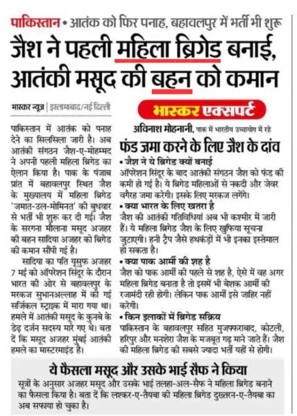 पाकिस्तान स्थित जैश-ए-मोहम्मद (JeM) जैसे आतंकी संगठनों ने अपनी रणनीति में पहली बार बड़ा बदलाव करते हुए ‘जमात-उल-मोमिनात’ नाम से महिला विंग का गठन किया है। इस ब्रिगेड की कमान खुद आतंकी सरगना “मसूद अजहर” की बहन, “सादिया अजहर” को दी गई है, जिसका आतंकी शौहर “यूसुफ अजहर” मई 2025 में ‘ऑपरेशन सिंदूर’ में भारतीय वायुसेना के हमले में मारा गया था।